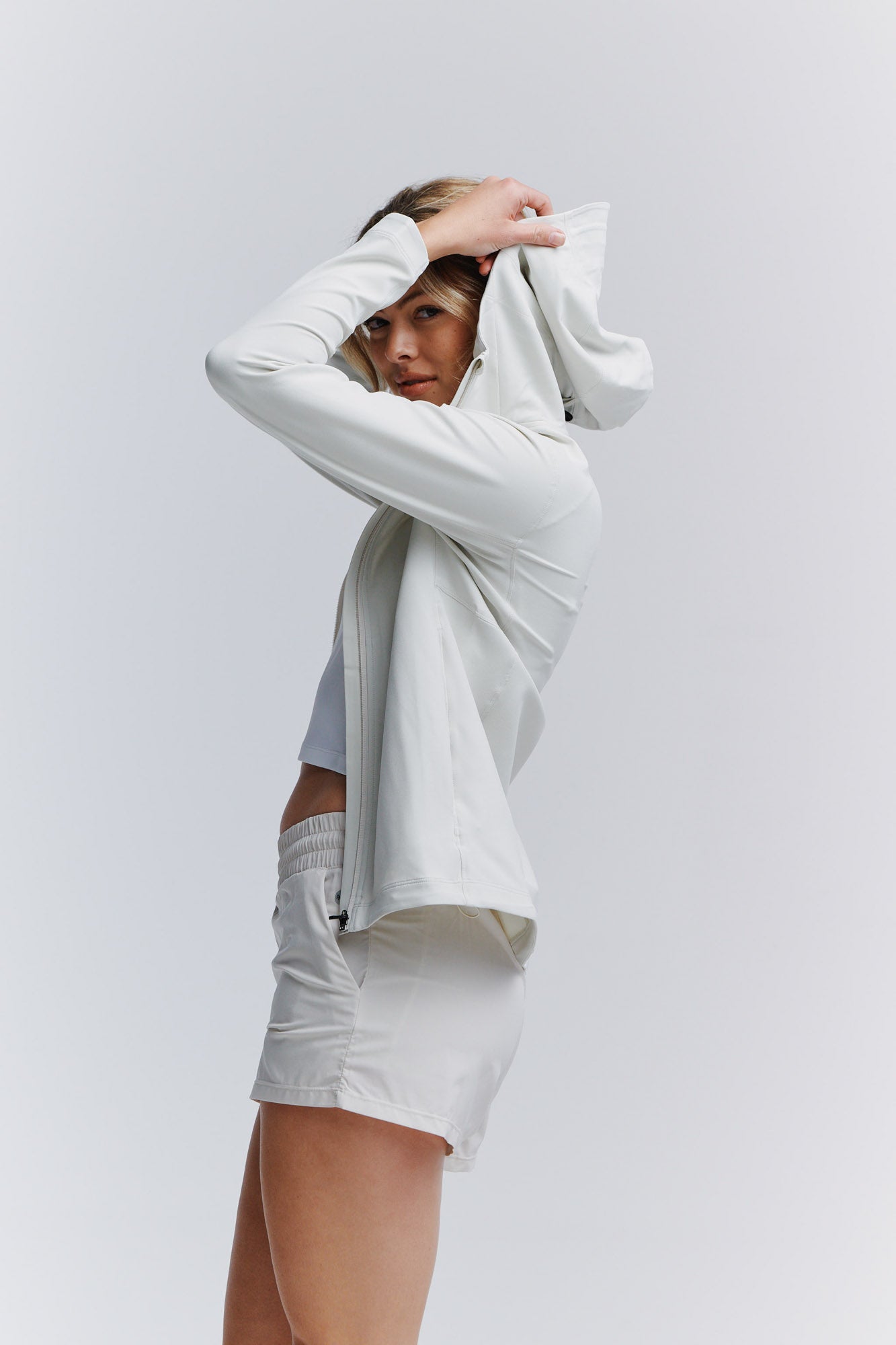 - Arm gussets that allows full functioning arm swings and reaches without movement form the bottom hem